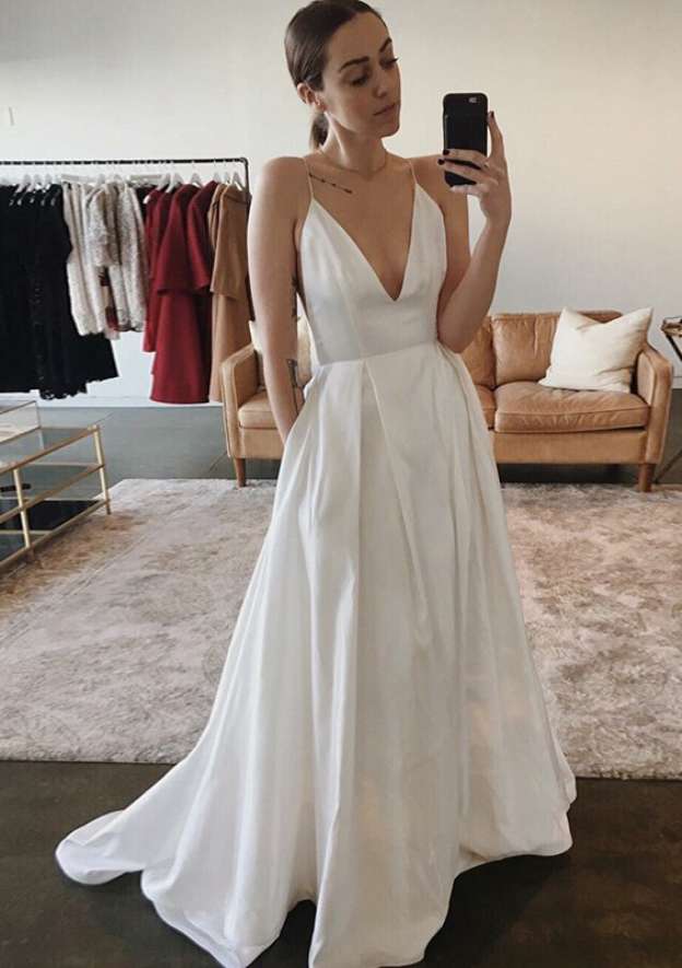 Ball Gown V Neck Open Back Satin Ivory Wedding Dresses With Wedding Dresses With Pockets Uk