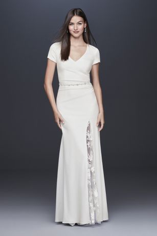 Crepe Sheath Gown With Embroidered Illusion Slit David S Bridal Wedding Dresses With Slit