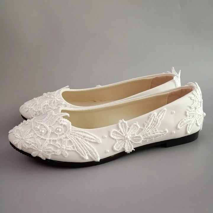 New Flat Women White Lace Wedding Shoes Flower Pearls Ankle Trap Wedding Flats White