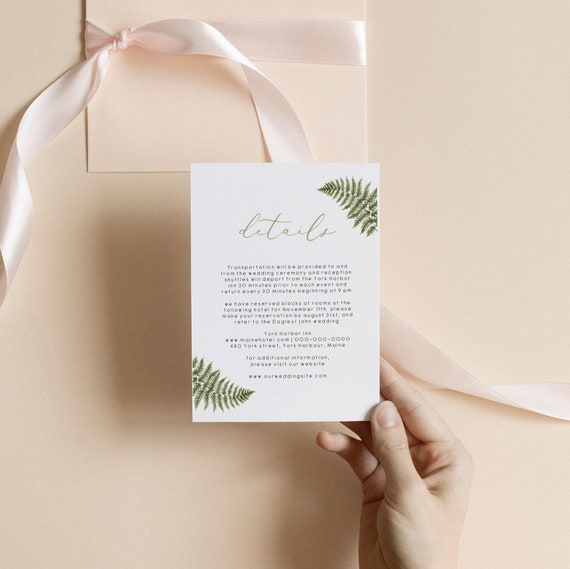 Fern Wedding Details Card Template Greenery Wedding Invitation Etsy Wedding Invitation Inserts Printing