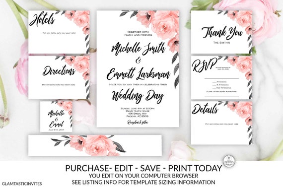 Coral Gray Floral Wedding Invitation Package Set Kit Editable Wedding Invitations Coral Color