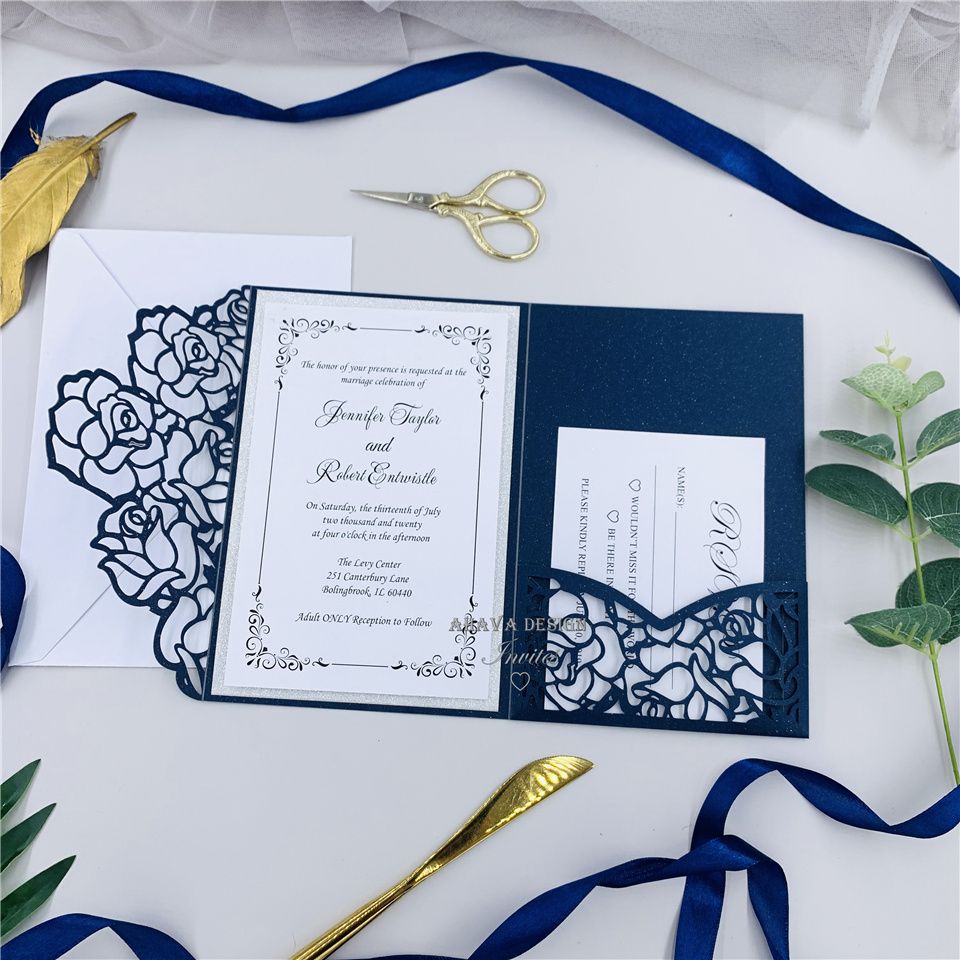 Elegant Navy Tri Fold Laser Cut Wedding Invite Laser Pocket With Wedding Invitations Diy Kits Cheap