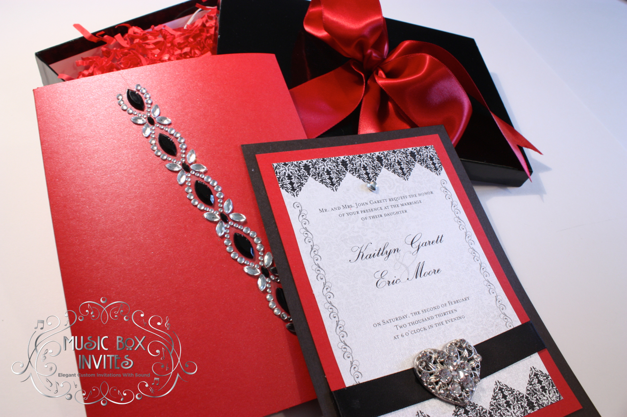 Red White And Black Brocade Romance Musical Wedding Invitation And Rsvp Card Comes In Musical Box That Sings Singing Music Boxed Invite In Crimson Totally Custom High End Class Couture Elegant Invite Wedding Invitations Red White And Black