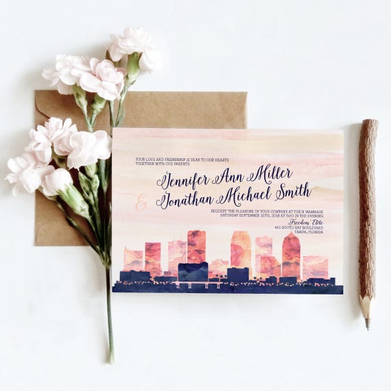 Tampa Fl Watercolor Skyline Wedding Invitations 6 Piece Etsy Wedding Invitations Tampa Fl