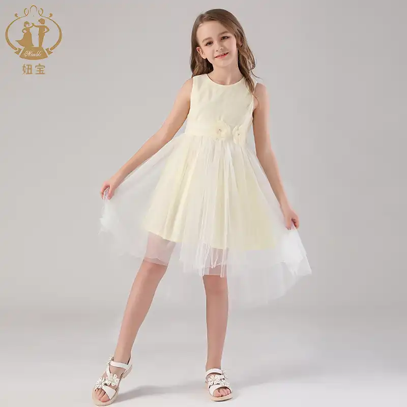 Nimble Summer Yellow Casual Sleeveless Applique Mesh Girl Dress Wedding Kids Dress Design
