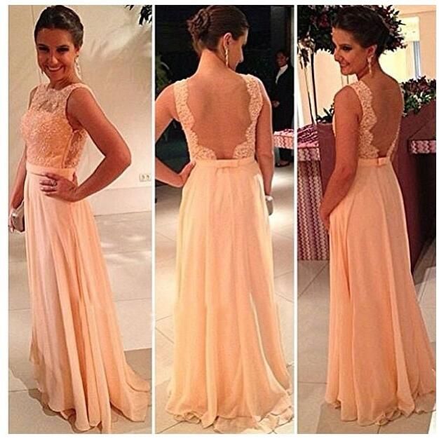 High Quality Nude Back Chiffon Lace Long Peach Color For Sale Wedding Maid Dress