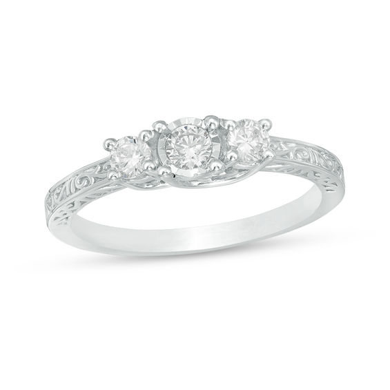 1 3 Ct T W Diamond Three Stone Filigree Scroll Engagement Ring In 10k White Gold Engagement Rings Wedding Zales Wedding Ring Filigree