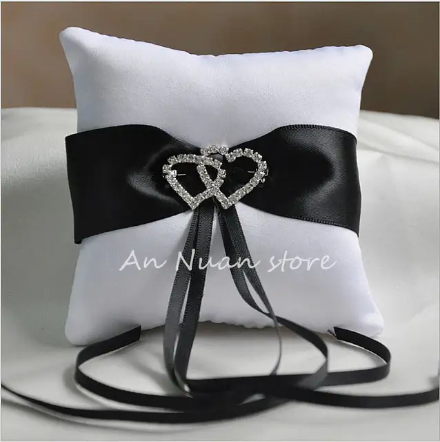 Romantic Black Ribbon Double Crystal Hearts Bow Wedding Ceremony Wedding Ring Holder Pillow