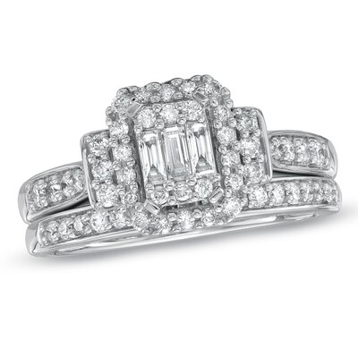 Wiley Hart Affordable Emerald Cut White Sapphire Halo Engagement Ring Wedding Ring Sets Emerald Cut