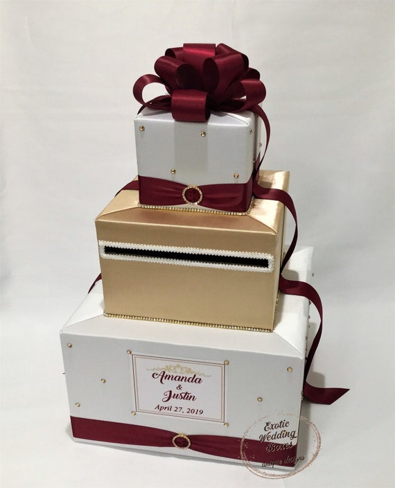 White And Champagne Wedding Card Box With Burgundy Ribbon And Etsy White And Champagne Wedding