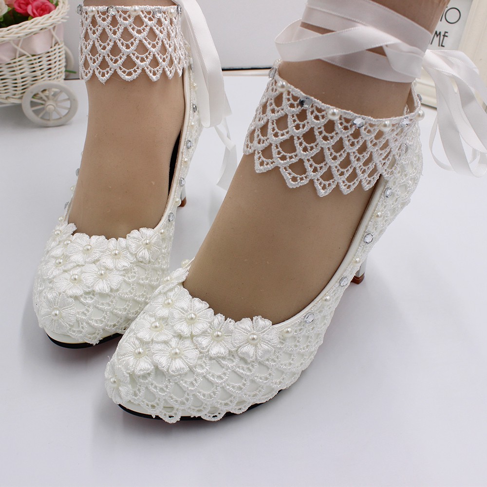 Vogue 8cm White Floral Lace Shiny Crystal Wedding Shoes Lace Prom Bridal Bridesmaid High Heels Shoes Shopee Singapore White High Heel Wedding Shoes