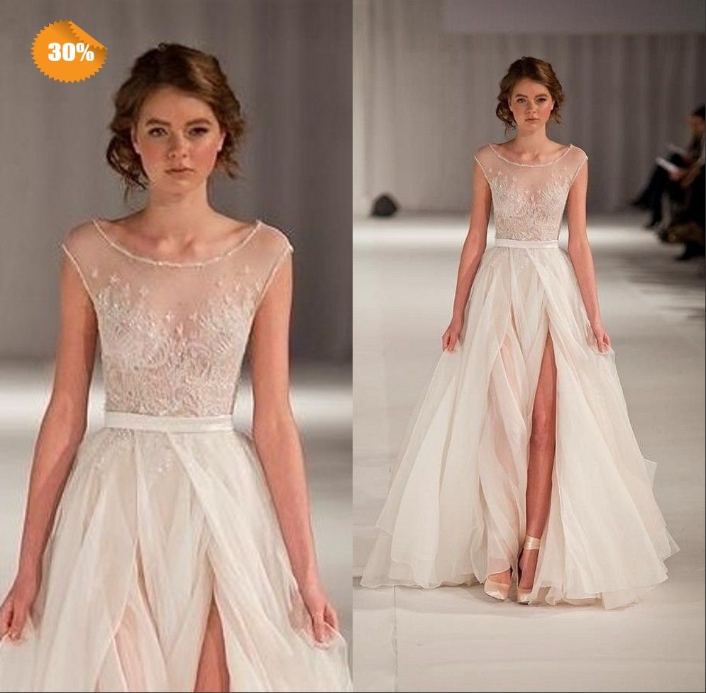 Discount Exquisite Sexy See Through Scoop A Line Front Slit White White Lace See Through Wedding Dress