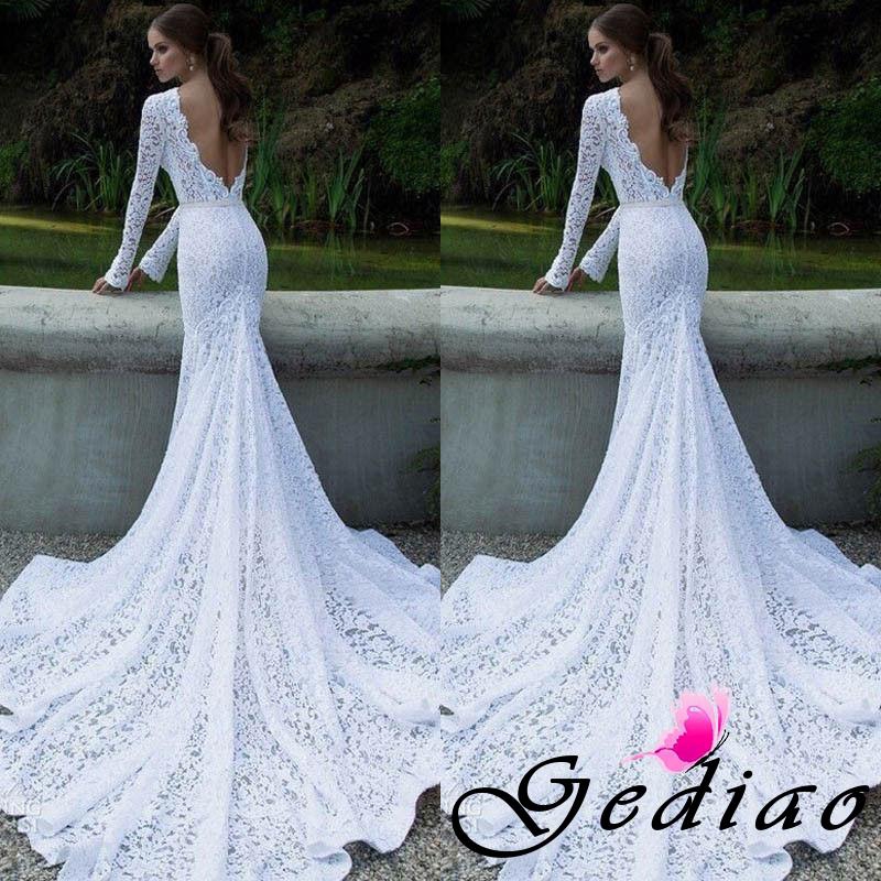 Discount 2018 White Lace Wedding Dress A Line Full Sleeves Bridal White Lace Wedding Dress