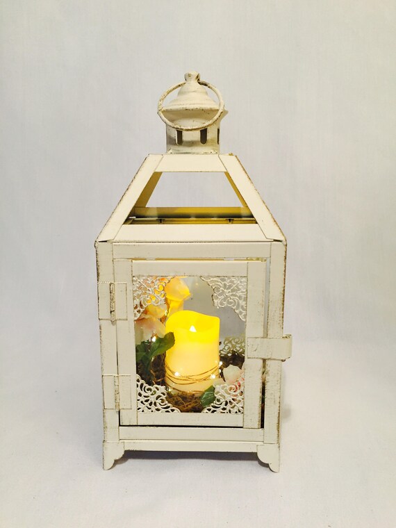 Picture Of A Whitewashed Lantern With Candles And Some Green And White Flroal Arrangements White Lantern Wedding
