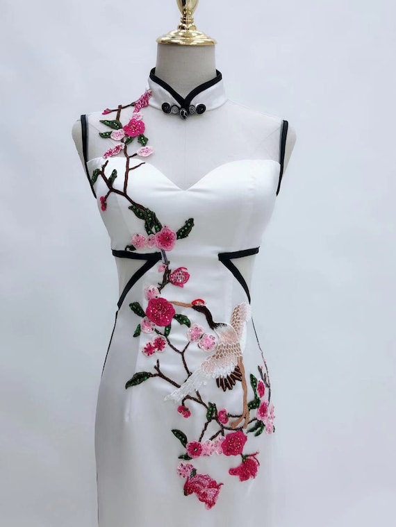 Black White And Red Chinese Cherry Blossom Floral Qipao Handmade White Modern Qipao Wedding Dress