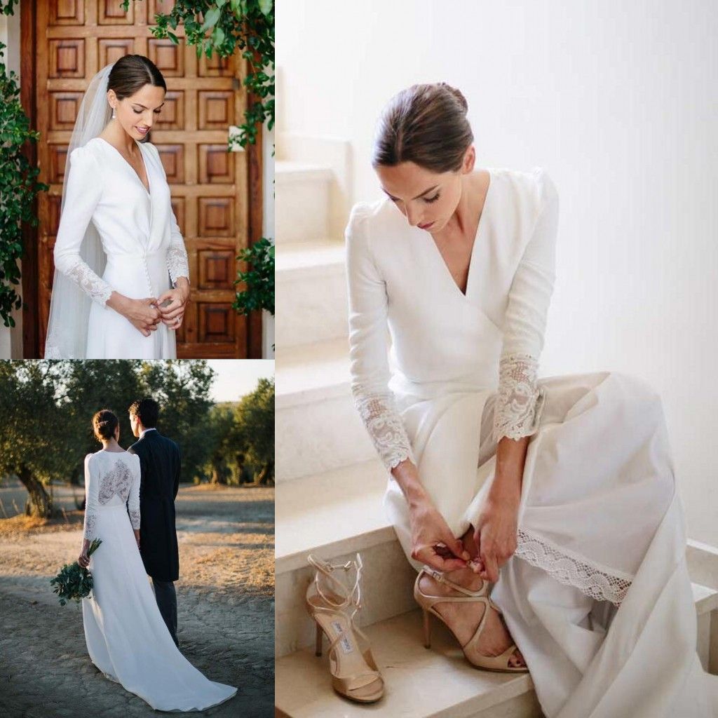 Elegant Lady Puffy Pleating White Deep V Neck Satin Long Sleeve A White Satin Long Sleeve Wedding Dress