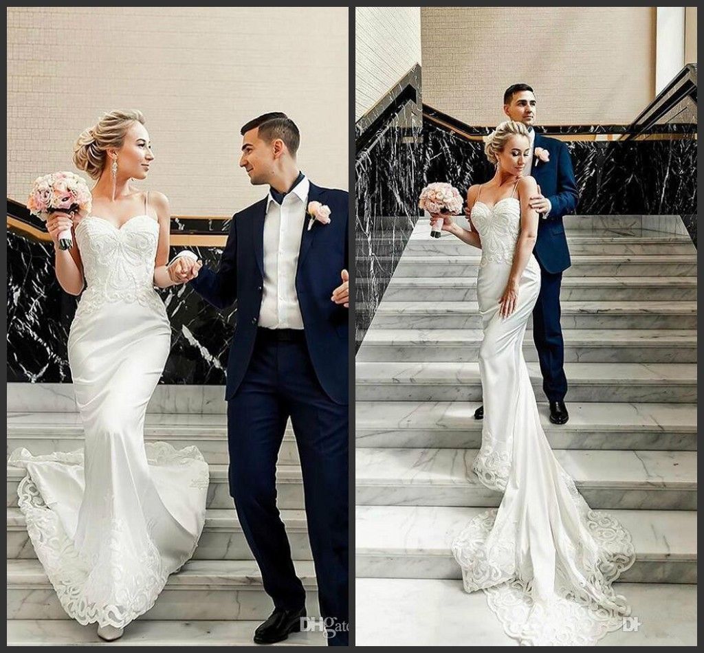 Elegant One Shoulder Sleeveless White Satin Split Thigh Sheath White Satin Sheath Wedding Dress