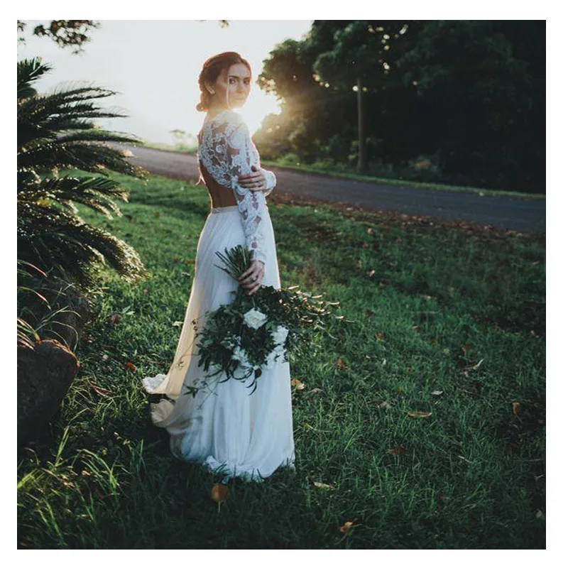 Sofuge Boho White Wedding Dress Deep V Neck Lace Top 2 Pieces White Wedding Dress With Green Lace