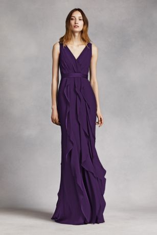 V Neck Wrapped Bodice Dress With Satin Belt David S Bridal White Wedding Dress With Purple Belt