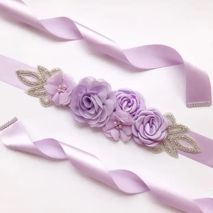 Flower Wedding Gowns With Belts Fashion Dresses White Wedding Dress With Purple Belt