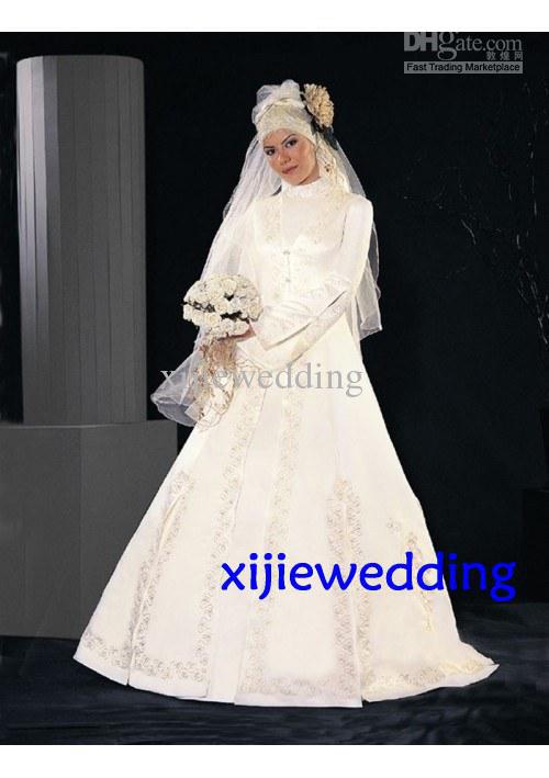 Muslim Wedding Dress White High Neck With Long Sleeves Jacket A Line Satin Bridal Dress Red Applique Without Veil Free Shipping White Wedding Dresses For Muslim Brides