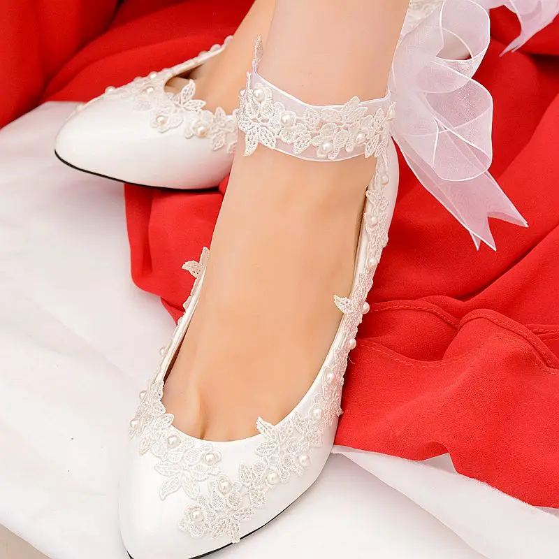 7cm White Women Shoes Wedges Lace Bridal Wedding Shoes Pearls White Wedding Shoes For Women